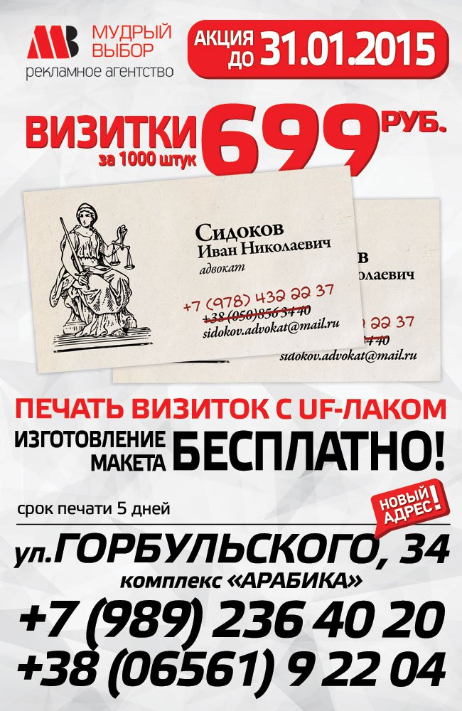 Внимание, акция! В связи с заменой номера мобильного оператора на +79...!!! Предлагаем Вам воспользоваться уникальной возможностью изготовления визиток всего за 699 руб.!