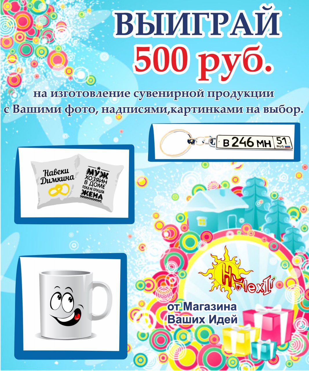 Каждый из Вас может выиграть подарочный сертификат на 500 рублей в Магазин Ваших Идей. С этим сертификатом Вы можете изготовить, себе или в подарок, сувенирную продукцию на выбор, с фотографиями, надписями или картинками.