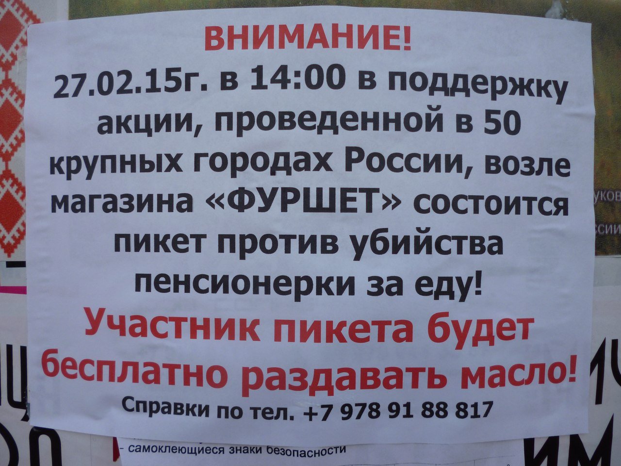 В Керчи появилось объявление, что сегодня, 27 февраля, в 14.00 возле магазина «Фуршет» состоится пикет против «убийства пенсионерки за еду». Как написано в объявлении, данное мероприятие пройдет в 50-ти городах России.