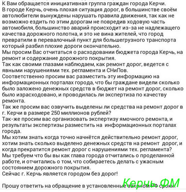 4го и 7-го мая, в 12:00, у центрального "Фуршета" будут собираться подписи для обращения в Керченскую городскую администрацию, по поводу состояния дорог в нашем городе, которое составил Виталий Наумов. Прошу репост. Не будьте равнодушными!!!! Не анонимно.