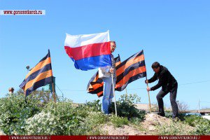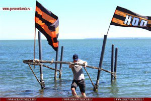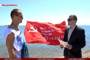 На почтительном расстоянии спортсмена сопровождал катер. На катере, как и на берегу, акцию сопровождали символикой в виде георгиевских лент, флагов Российской Федерации, копии знамени Победы.