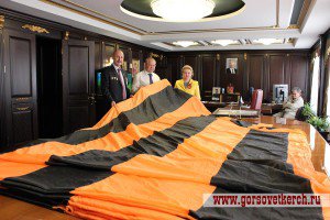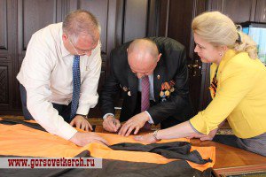 Заслуженный работник курортов и туризма Республики Крым Василий Стадольский, 7 мая, подарил администрации Керчи 100-метровое шелковое полотно георгиевской ленты. Ширина ткани составляет 3 метра.