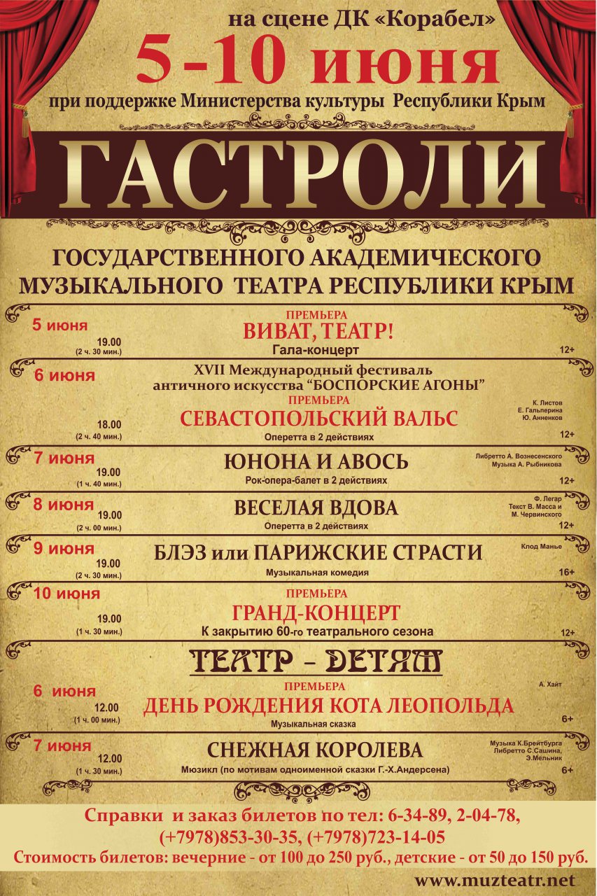 В Керчи, с 5 по 10 июня снова гастроли Государственного академического музыкального театра республики Крым в ДК «Корабел» представляют: