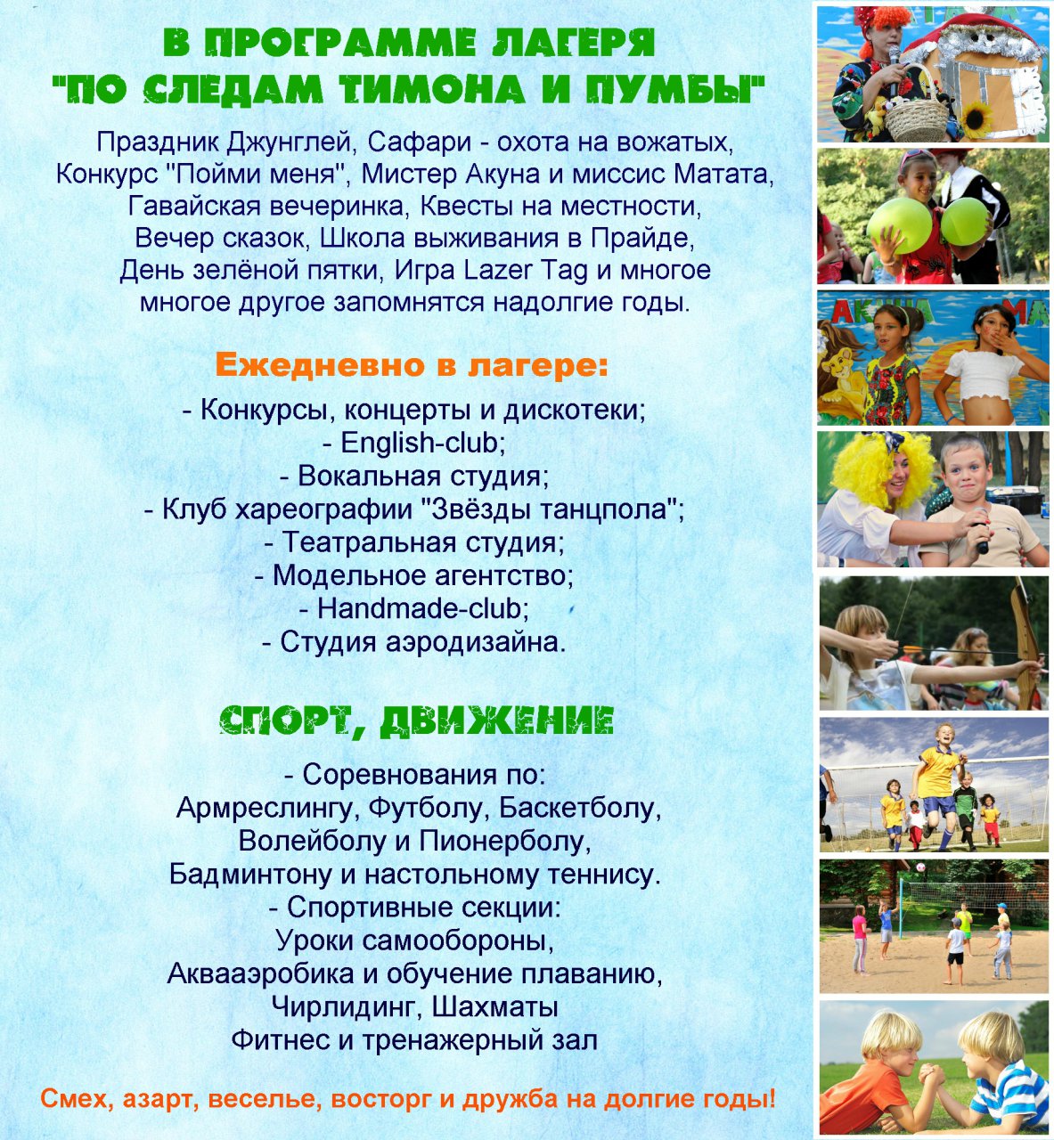 Хороший отдых детей летом - это залог здоровья на весь год. Детский оздоровительный лагерь « Акуна Матата» - это незабываемые эмоции, новые знакомства и неимоверное количество ярких впечатлений. «Акуна-Матата» означает «НЕТ ПРОБЛЕМ» или «ВСЕ БУДЕТ ХОРОШО». Это девиз нашего лагеря, в котором у детей нет проблем, а родители знают, что с их детьми в с е б у д е т х о р о ш о :) К детям здесь относятся с любовью и уважением, а к пожеланиям родителей- с серьезным вниманием и пониманием.