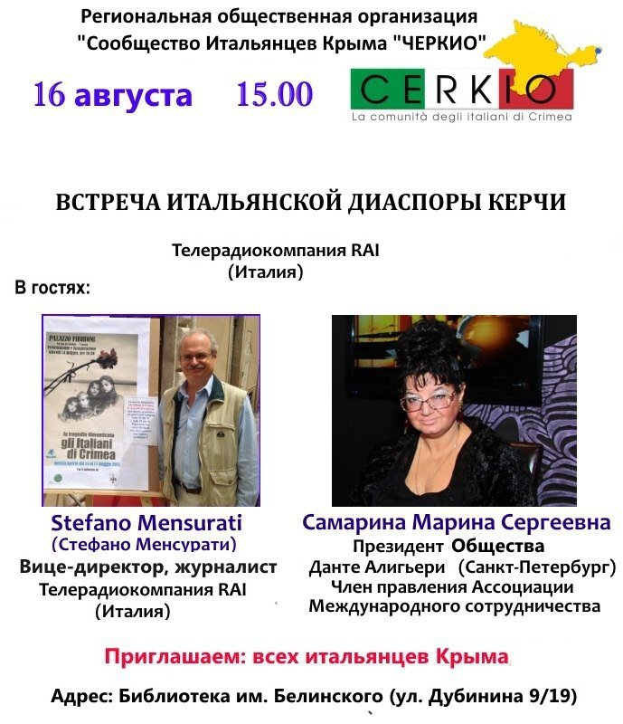 В Керчи 16 августа в 15.00 в библиотеке им. Белинского пройдет встреча итальянской диаспоры Керчи. Об этом Керчь.ФМ сообщили организаторы.