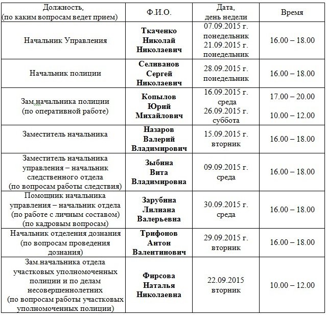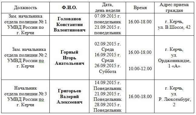 приема граждан начальниками отделов полиции УМВД России по г. Керчи в сентябре 2015 г.