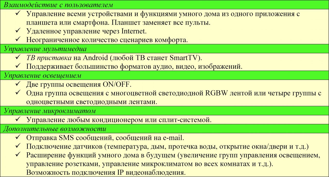 Возможно формирование индивидуальных комплектаций оборудования в соответствии с желаемыми функциями умного дома.