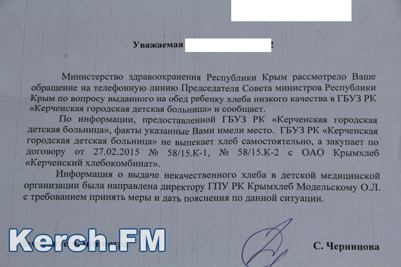 Также в ответе женщине сообщили, что ГБУЗ РК «Керченская городская детская больница» не выпекает хлеб самостоятельно, а закупает по договору с ОАО Крымхлеб «Керченский хлебокомбинат».