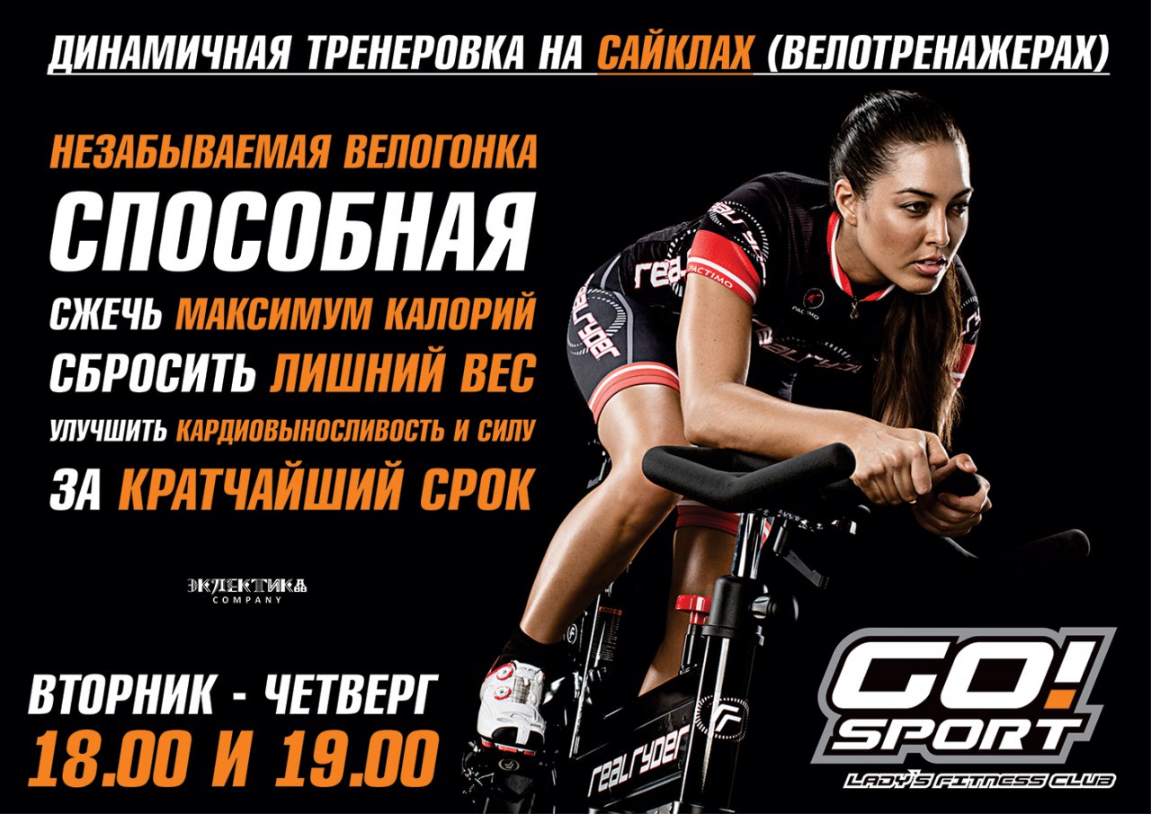 Сайкл – это высокоинтенсивные аэробные занятия на стационарных велосипедах – сайклах – имитирующие гонки с различной интенсивностью. Направленные на быстрое снижение веса и позволяет быстро подтянуть мышцы. Тренировки укрепляют сердечнососудистую и дыхательную систему, а также дают высокую нагрузку на мышцы бедер и ягодиц. Тренер – Юлия Антонова