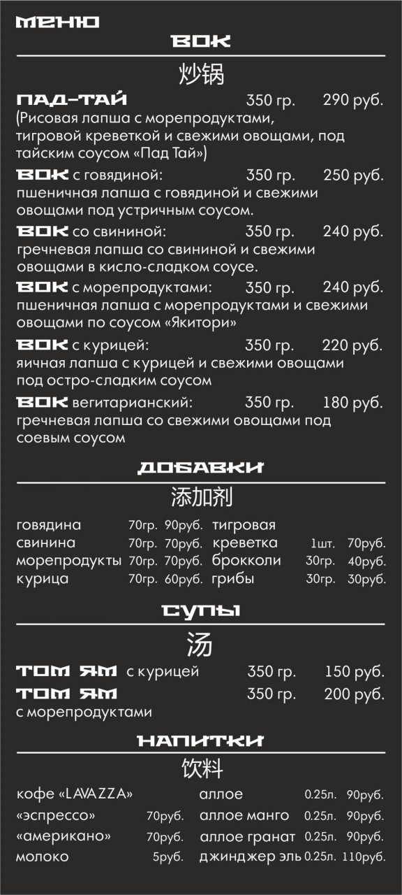 «Wok Del Mar» - еда для ценителей паназиатской кухни и всех кто любит оригинальные и экзотические блюда! Приходите попробовать лапшу легендарных китайских кварталов и знаменитый Пад Тай, Пем Ям – Королевства Тайланд. Перекусывайте быстро, но полезно!!!