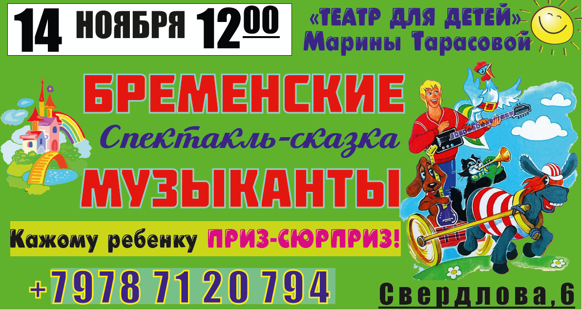 14 ноября (суббота) в 12:00 на сцене ГКЦ им. Ю.Богатикова (Свердлова, 6) спектакль для детей «БРЕМЕНСКИЕ МУЗЫКАНТЫ»