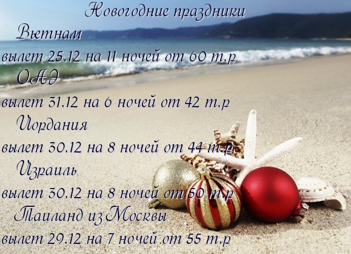 Мечтаете об ослепительно ярком солнце, бескрайнем теплом море и потрясающей красоты экзотической природе? Тогда почему бы не подарить себе и близким в качестве подарка под елку поездку на Новый год на море? Таиланд, Индия, Доминикана, Куба, Мексика, Мальдивы, Индонезия, ОАЭ, Вьетнам - каждое их этих направлений подарит Вам незабываемую встречу Нового года 2016.