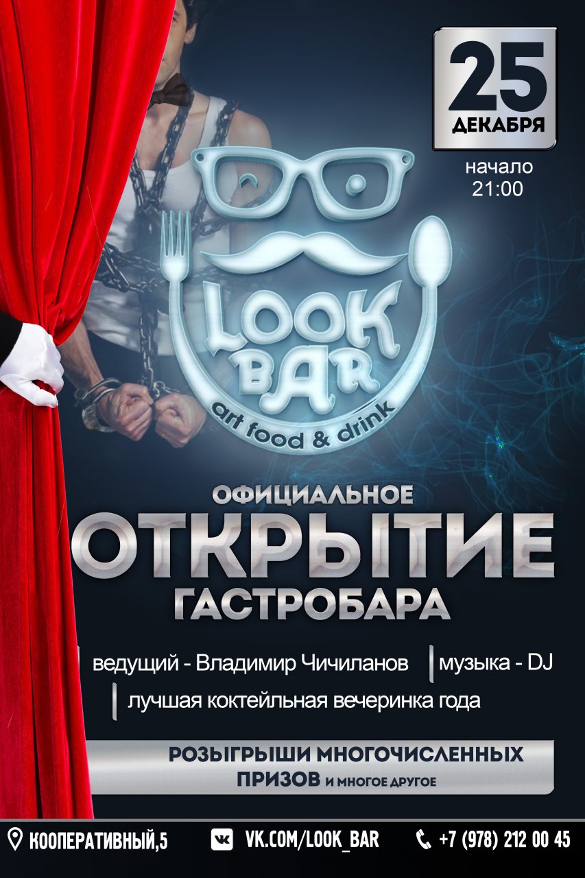 Дорогие друзья, 25 декабря состоится официальное открытие гастробара «LOOK BAR». Вас ждет лучшая коктейльная вечеринка года! А так же розыгрыш многочисленных призов.
