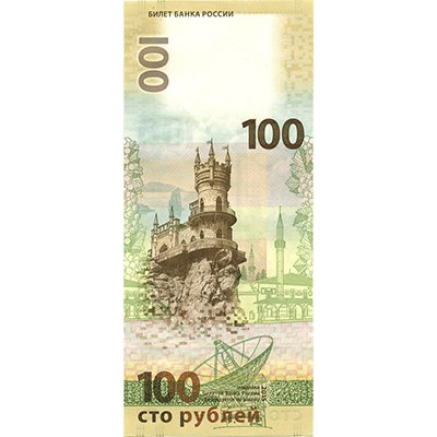 Банкнота изготовлена на тонированной в светло-желтый цвет хлопковой бумаге. Одна сторона банкноты посвящена Севастополю, другая сторона – Крыму. В бумагу внедрена широкая защитная нить, выходящая на поверхность в окне фигурной формы на стороне банкноты, посвященной Севастополю. Многотоновый комбинированный водяной знак расположен на светлом поле в верхней части банкноты.