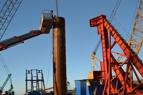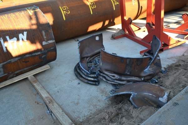 "Эта свая попала в более плотные грунты и гидромолот превратил ее верхнюю часть в гармошку. Ничего страшного или критичного в этом нет, обычный производственный момент, однако смятая как ткань труба со стенками по 2 сантиметра выглядит весьма необычно. По крайней мере на мой взгляд.