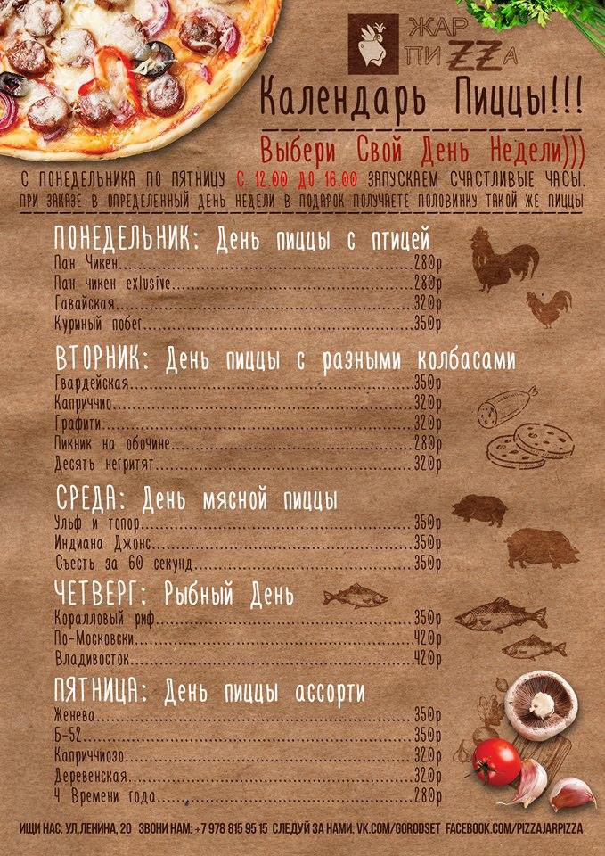 Закажи пиццу из Календаря Пиццы в будние дни с 12.00 до 16.00 и мы подарим тебе ещё половину такой же)