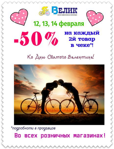 А если ваша вторая половинка увлекается спортом, тогда вам в магазин Велик! Здесь тоже действует акция, по которой можно купить второй товар за пол цены. Например, приобрести красивый велосипед или экипировку, аксессуары по хорошей цене.