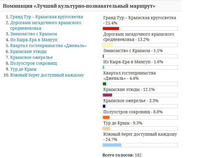 По информации Минкурортов, в номинации «Лучший культурно-познавательный маршрут» подано 10 работ, «Лучший маршрут по местам героев кинематографа» – 10, «Лучший маршрут выходного дня» – 8, «Лучший экологический маршрут» – 7, «Лучший этнографический маршрут» – 5, «Лучший религиозный маршрут» – 5, «Лучший гастрономический маршрут» – 4.