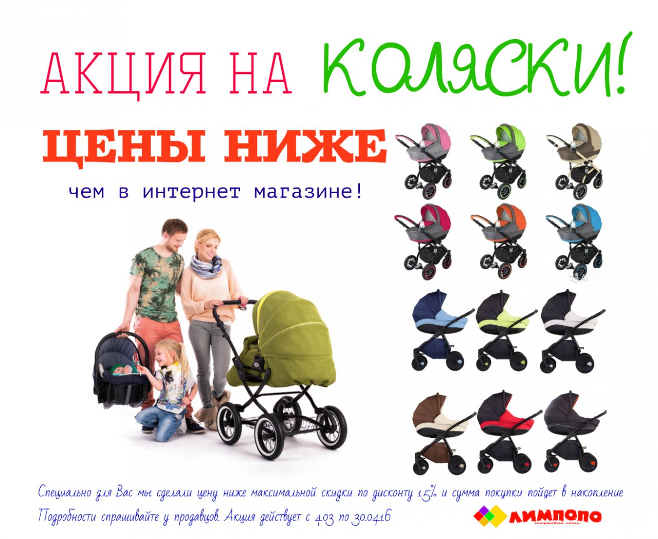 С 4 марта сеть детских магазинов ЛИМПОПО запускает акцию «Цены ниже, чем в интернете!*», которая распространяется на все детские коляски во всех магазинах Лимпопо!