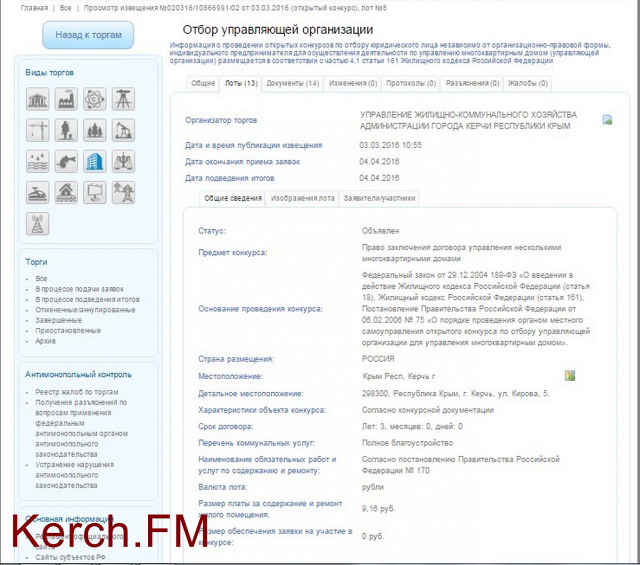 Информацию о проведении торгов разместило УЖКХ города Керчи. Все 13 лотов, независимо от дома, предложено обслуживать за 9 рублей 16 копеек.