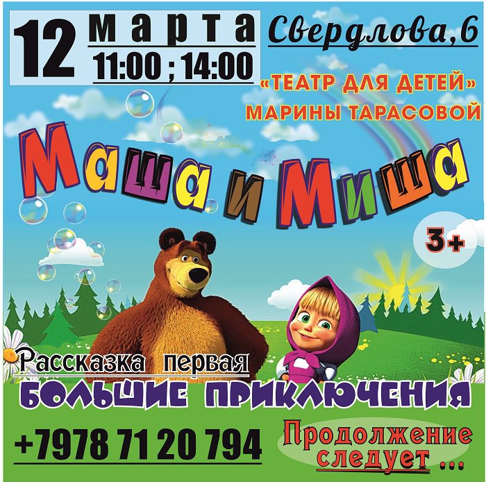 Сказка собирает друзей! 12 марта на сцене ГКЦ им. Ю. Богатикова спектакль для детей "МАША И МИША". Начало в 11:00 и 14:00.