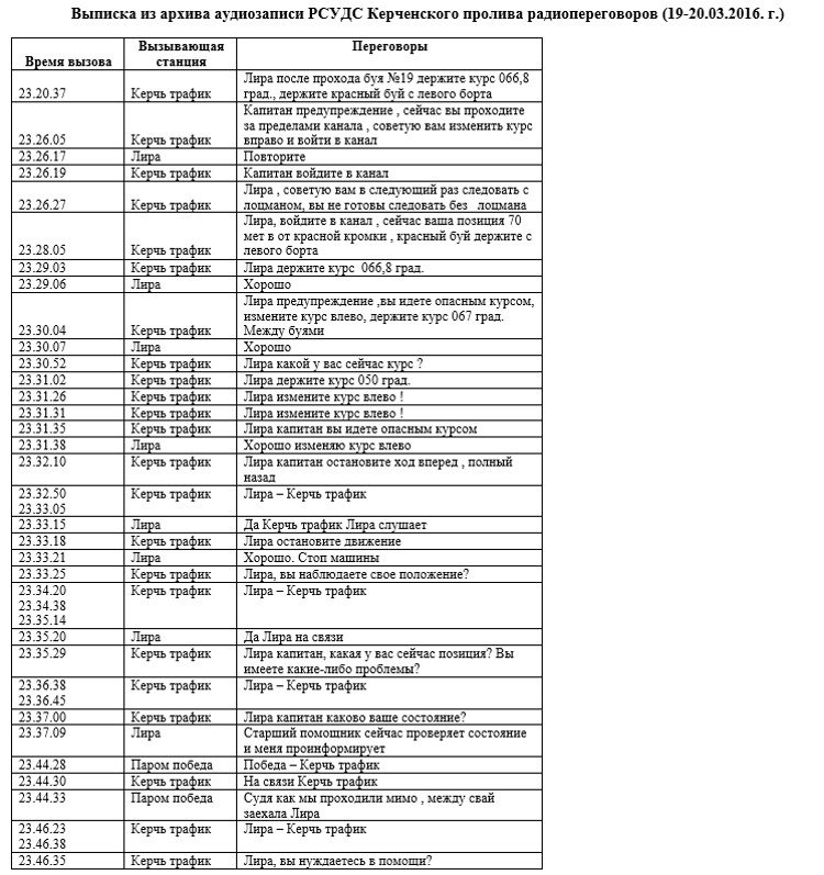 Через полминуты оператор командует капитану дать «полный назад», еще через минуту остановить все машины судна. Капитан судна якобы соглашается, но последующие две минуты не выходит на связь. В 23.37 из Керчи следует вопрос о состоянии судна, на что с судна отвечают, что проверяют его состояние.