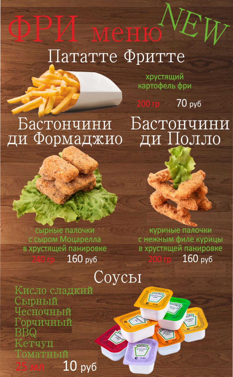 А также, КУРИНЫЕ ПАЛОЧКИ с сочным филе курицы и хрустящая КАРТОШКА ФРИ!