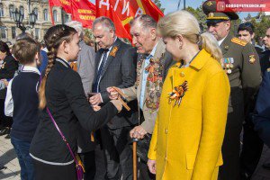 Почтили минутой молчания павших. Дети внесли на площадь огромную георгиевскую ленту и раздали символические маленькие ленточки всем присутствующим.