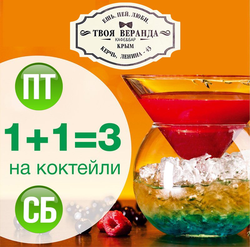 И это ещё не всё: по пятницам и субботам Коктейльные Выходные на Твоей Веранде. При заказе 2х любых коктейлей третьим угощаем бесплатно.