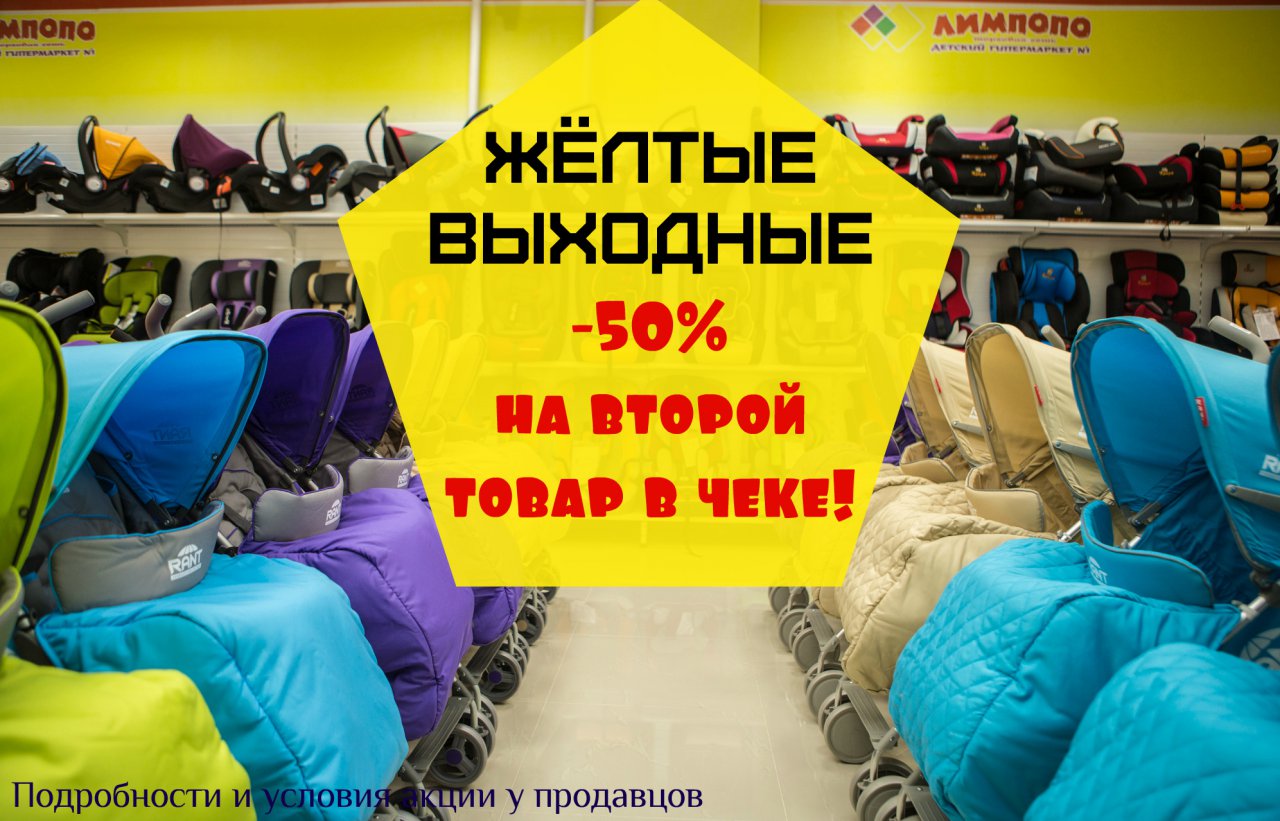 «Желтые выходные. Скидка -50% на каждый второй товар в чеке* в магазинах ЛИМПОПО, ВЕЛИК и EuroKids».