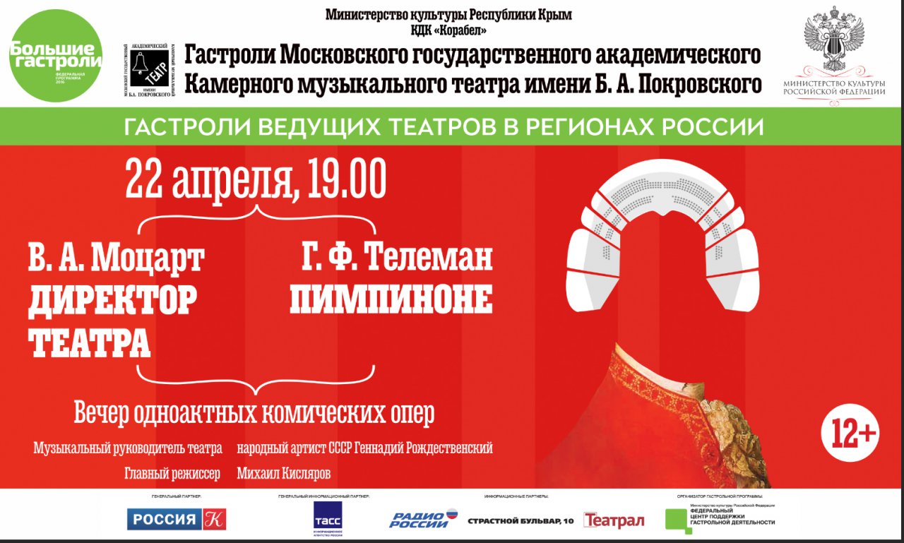 22 апреля в 19:00 на сцене КДК «Корабел» гастроли Московского государственного академического Камерного музыкального театра им. Б.А. Покровского. Проходят в рамках программы «Большие гастроли 2016» Федерального центра поддержки гастрольной деятельности Министерства культуры Российской Федерации. Театр гастролирует с оркестром