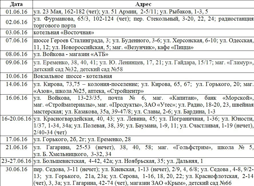 ГУП РК «Крымэнерго» сообщает о том, что в связи с плановым ремонтом электрооборудования в июне с 8 до 17 часов будут происходить отключения линий электропередачи согласно нижеприведенному графику, - передает Керчь.ФМ.