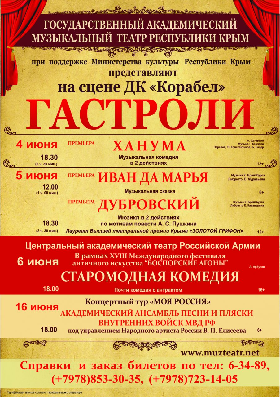 В Керчи, с 4 по 6 июня, а также 16 июня пройдут гастроли Государственного академического музыкального театра Республики Крым в ДК «Корабел».