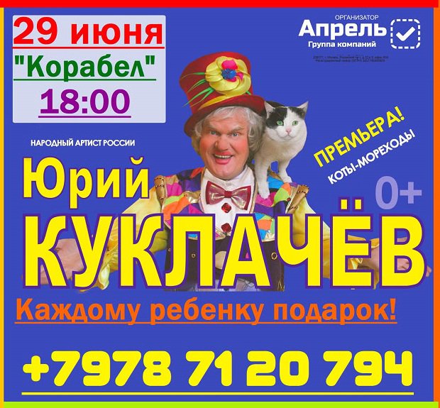 Море позитива! Только один день - 29 июня в 18:00 на сцене КДК "Корабел" Народный артист России Юрий Куклачев. Не пропустите! "КОТЫ-МОРЕХОДЫ" - премьера! Каждому ребенку - ПОДАРОК!