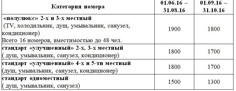 Проживание, 3-х разовое комплексное питание, автостоянка, спортивная площадка, посещение пляжа, пользование пляжным и спортивным инвентарем, мангалом, услуги аниматора.