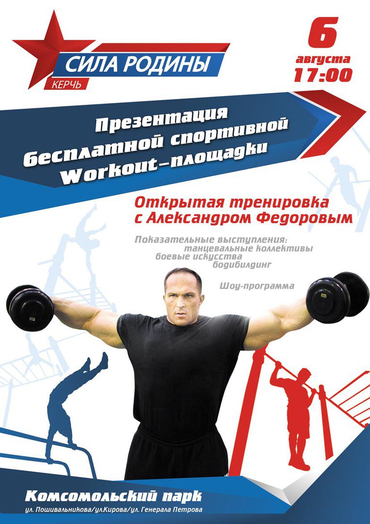 В Керчи, 6 августа, в Комсомольском парке пройдет презентация площадки для занятий Workout. Об этом сайту Керчь.ФМ сообщили организаторы мероприятия.