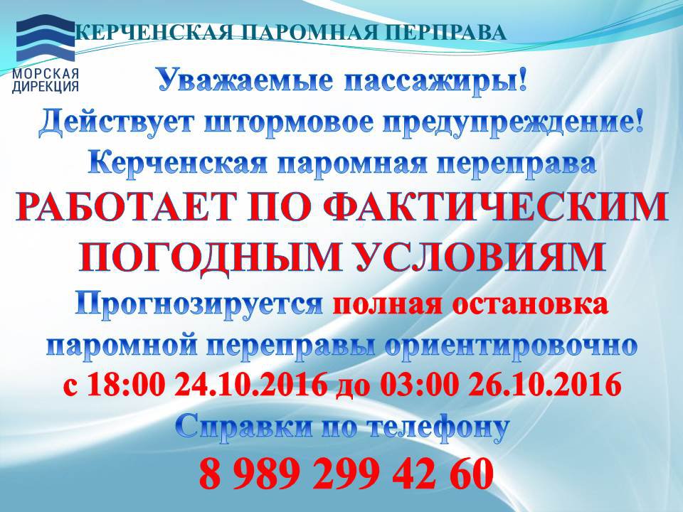 На Керченской паромной переправе сегодня, 24 октября, прогнозируется полная остановка работы. Как сообщает ООО «Морская дирекция», приостановить работу переправа может ориентировочно с 18.00, - передает Керчь.ФМ. На данный момент переправа работает по фактической погоде в условиях штормового предупреждения.