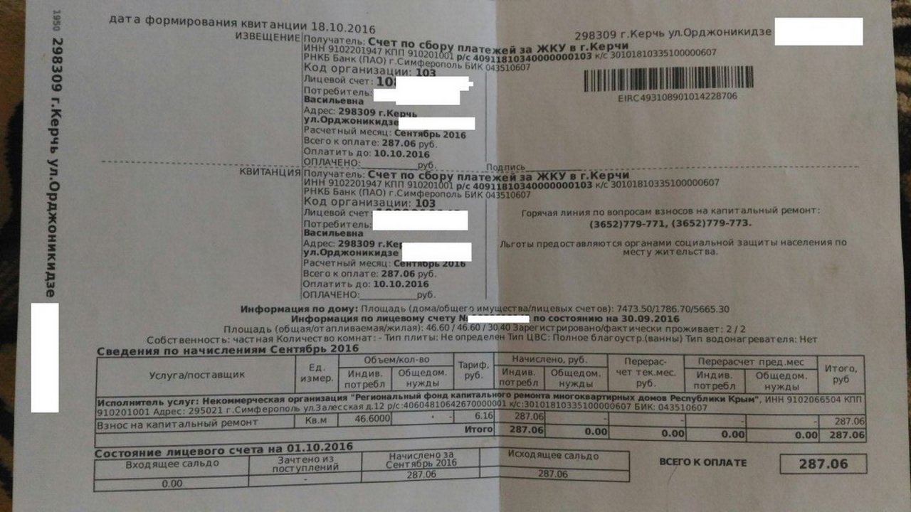 Отметим, что квитанция за сентябрь была сформирована 18 октября. В квартиры керчан квитанции начали приходить с 24 октября. Но оплатить сумму за капремонт необходимо было до 10 октября.