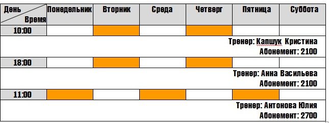 8 тренировок (1500 р), 12 тренировок (1900 р), 16 тренировок (2300 р)