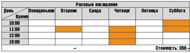 8 тренировок (2900 р), 12 тренировок (3900 р)