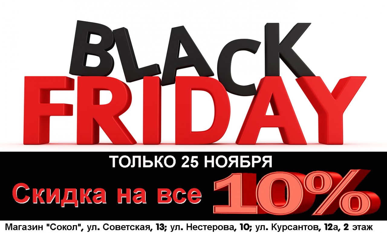 Только один день, 25 ноября, в сети магазинов «Сокол» - «Черная пятница». Скидки на все товары - 10%.