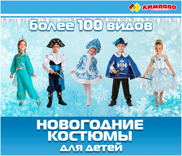 Новый год – это не только уютная атмосфера, веселье и сюрпризы, главный праздник года ознаменуется хлопотами. «Лимпопо» поможет их избежать! У нас Вы сможете купить не только новогодние подарки, но и незаменимые карнавальные костюмы для утренников, которые наполняют праздничную атмосферу волшебством и превращают детей в сказочных героев.