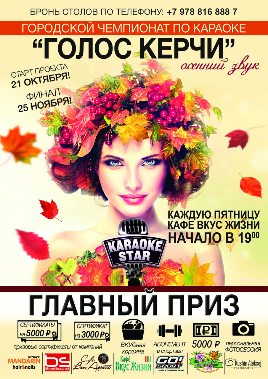 На прошлой неделе, в пятницу, был завершен вокальный проект «ГОЛОС КЕРЧИ: осенний звук». Конкурс прошел при поддержке: Кафе Вкус Жизни, Cafe Bon Appetit, GO!Sport, Mandarin-sport, "Квиточка", Beat Sound, а также семейного фотографа Алексея Кушина.