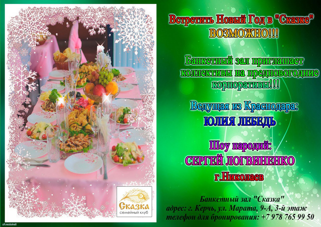 Семейный клуб «Сказка» готовит в этом году особенную новогоднюю программу: специальное новогоднее меню, ведущая из города Краснодар, шоу пародий и много-много сюрпризов для своих клиентов!