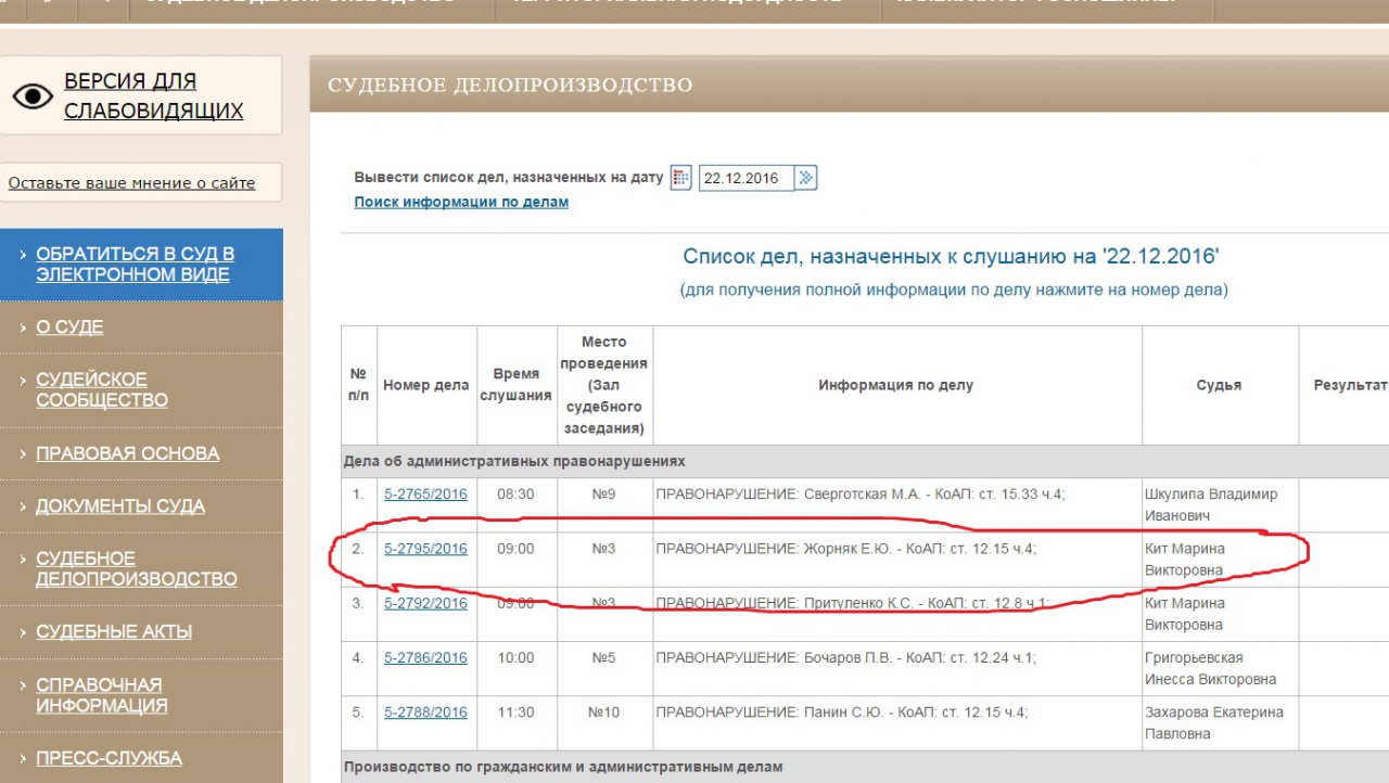 Также, по информации сайта Керченского городского суда, сегодня утром прошло заседание по делу об административном правонарушении Жорняк Е.Ю. по статье КоАП: ст. 12.15 ч.4 – выезд на полосу встречного движения.