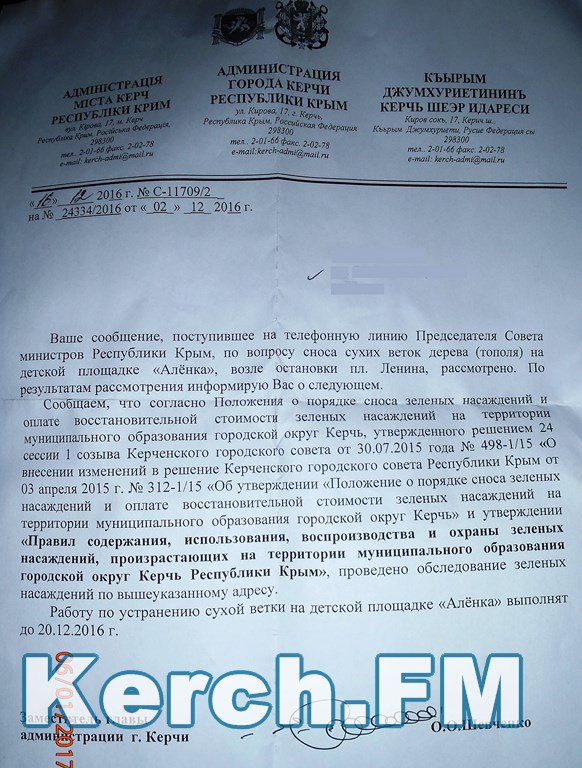 Керчанин обращался с данной проблемой на телефонную линию Совета Министров Крыма. В декабре, на тот момент заместитель главы администрации Керчи Олег Шевченко ответил жителю города, что комиссия обследовала зеленые насаждения по данному адресу. В конце письма указано, что «работу по устранению сухой ветки на детской площадке «Аленка» выполнят до 20 декабря 2016 года». Письмо датировано 16 декабря.