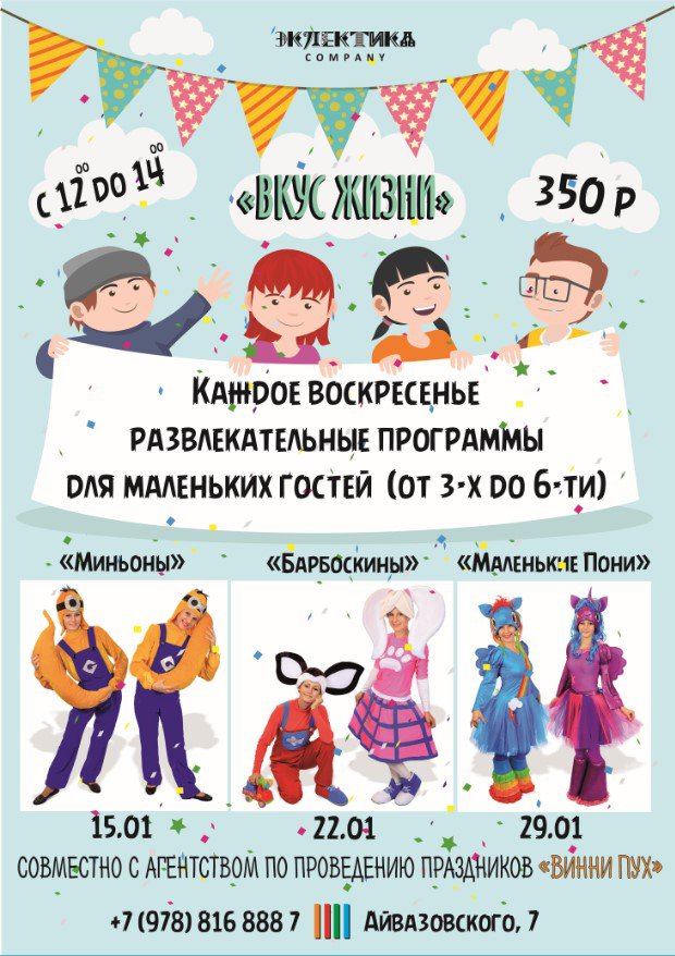 Каждое ВОСКРЕСЕНЬЕ с 12:00 до 14:00 совместно с агентством по проведению праздников "Винни Пух" в кафе "Вкус Жизни" по расписанию развлекательная программа в компании озорных мультгероев. Мальчишек и девчонок ждет увлекательное путешествие в мир игор, танцев, конкурсов, загадок, разукрашек и прочих развлечений. Для детворы веселые аниматоры запустят салют из мыльных пузырей. Каждому маленькому гостю будет вручен воздушный шар, а по желанию можно нарисовать забавную мордашку благодаря аквагриму.
