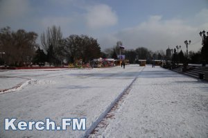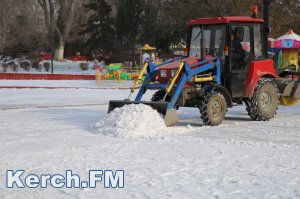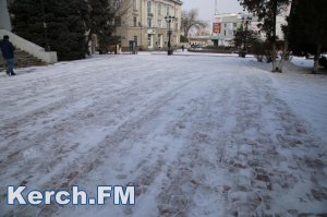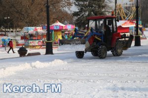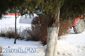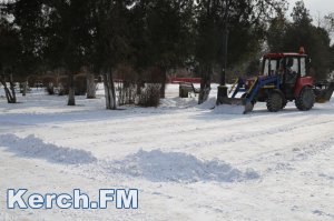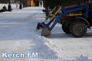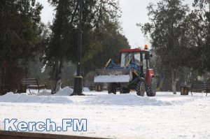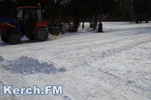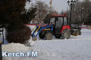В Керчи снегоуборочный трактор расчищает от снега площадь Ленина