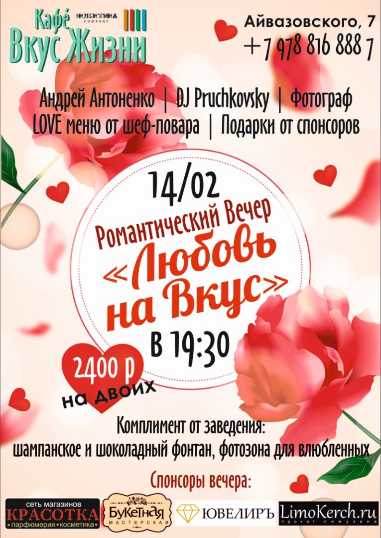 14 февраля команда «Вкуса Жизни» приглашает Вас на праздничный вечер. Давайте вместе растворимся в атмосфере романтики.
