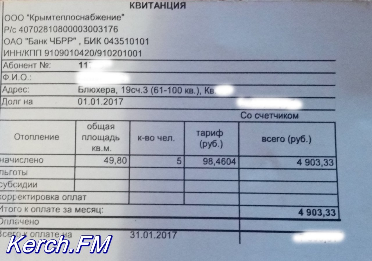 В редакцию Керчь.ФМ возмущенные читатели продолжают присылать платежки за отопление, которые керчанам пришли за январь 2017 года. Так в одном из домов по ул. Блюхера цена за квадратный метр достигает 98 рублей. Так, за 49 квадратов керчане заплатят почти 5 тысяч. И это только за отопление и только за январь.